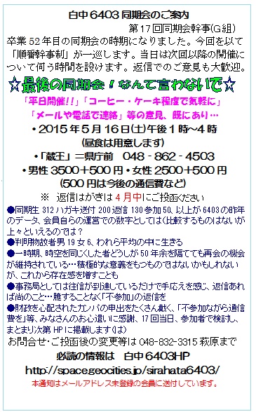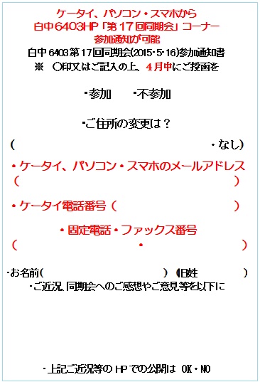 17回同期会を下記要領で実施させていただきます。 Eメールでの出欠も受け付けています。下記返信書式を参考にお送りください。 宛先は、 こちら まで!